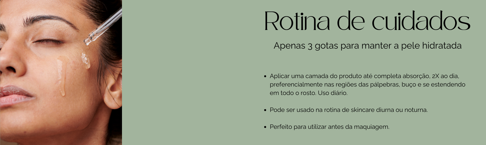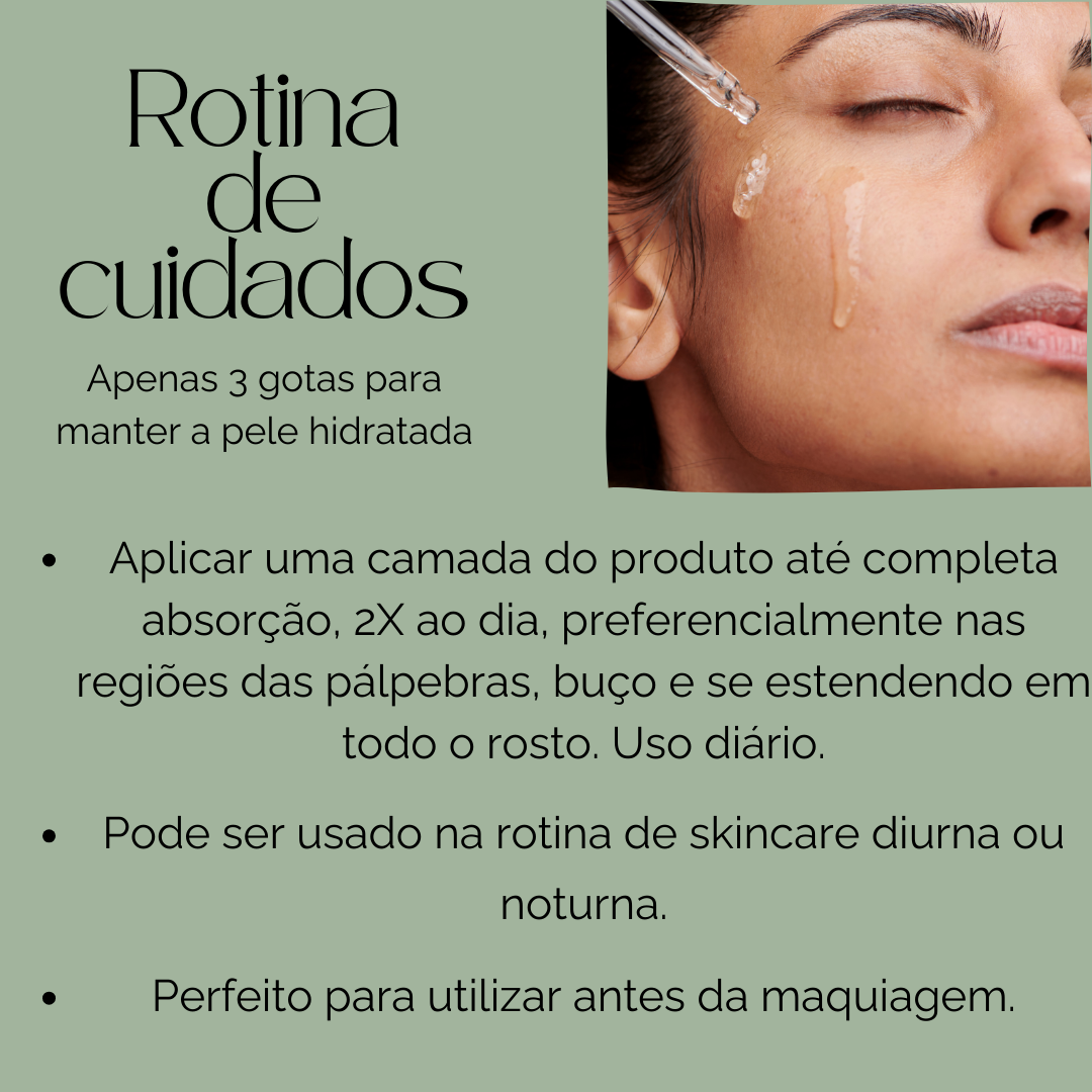 Modo de uso: Aplicar uma camada do produto até completa absorção, duas vezes ao dia, preferencialmente nas regiões das pálpebras, buço e se estendendo em todo o rosto. Uso diário.