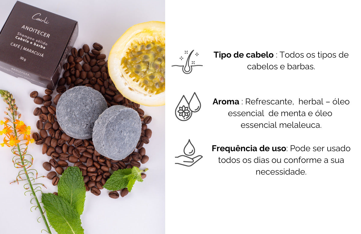 Composição: sodium cocoyl isethionate, Coffea arabica seed extract, Ricinus communis seed oil, Copaifera officinalis oil, Vitis vinifera seed oil, Passiflora edulis seed oil, hydrolyzed rice protein, tocopheryl acetate, sorbitan caprylate, Melaleuca alternifolia leaf oil, Mentha piperita leaf oil, charcoal powder.